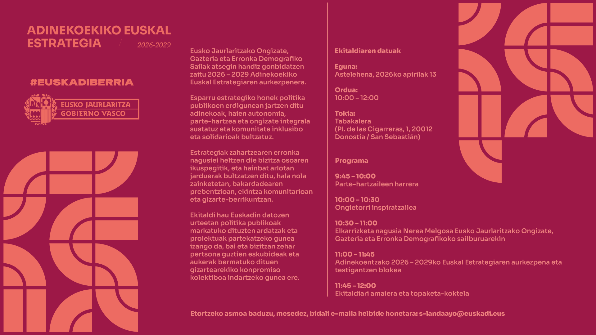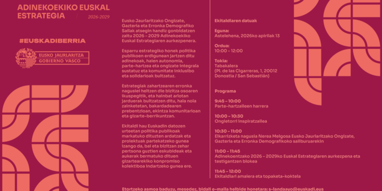 Datorren 2026ko apirilaren 13an, Eusko Jaurlaritzak Donostian aurkeztuko du 2026-2029 Adinekoekiko Euskal Estrategia. Ekitaldia Tabakaleran izango da, Ongizate, Gazteria eta Erronka Demografikoko Sailak antolatuta, eta helburua adinekoak politika publikoetan erdigunean jartzea da.